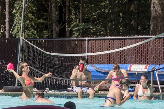 Relax at the pool deck featuring two swimming pools, including one designed for water volleyball. There is also a sport court featuring basketball hoops, horseshoes, and more!